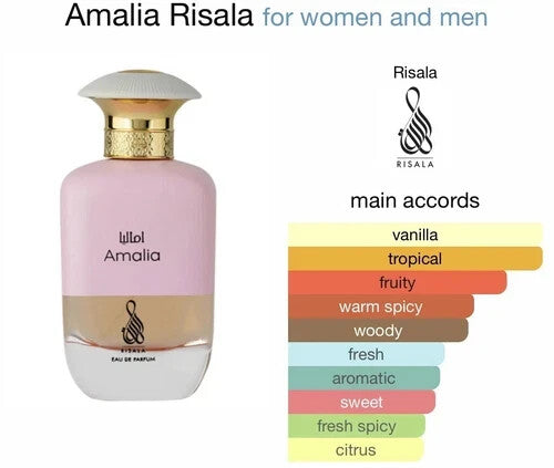 Amalia from the Risala Collection by Sterling Perfumes is a captivating fragrance that blends spice, citrus, and rich woody notes into a luxurious olfactory experience. It opens with a bold yet refreshing burst of cloves, lemon, and grapefruit, creating an invigorating and slightly spicy citrus introduction. The heart unveils an exotic blend of tropical fruits, aromatic rosemary, and the warm sophistication of saffron, adding depth and intrigue. As it settles, the fragrance reveals a sensual base of creamy vanilla, earthy woody notes, and the opulent allure of agarwood (oud), leaving a lasting impression of warmth and refinement. Amalia is a statement scent for those who embrace elegance with a touch of mystery.