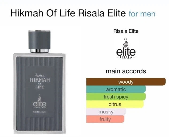 Hikmah Of Life by Risala Elite is a fragrance for men. This is a new fragrance. Hikmah Of Life was launched in 2024. Top notes are Grapefruit, Bergamot and Black Currant; middle notes are Green Mandarin, Geranium, Ambrette, Vetiver and Ginger; base notes are Balsam Fir, Patchouli, Cashmeran, Dry Wood, Vetiver, Cedar and Tonka.