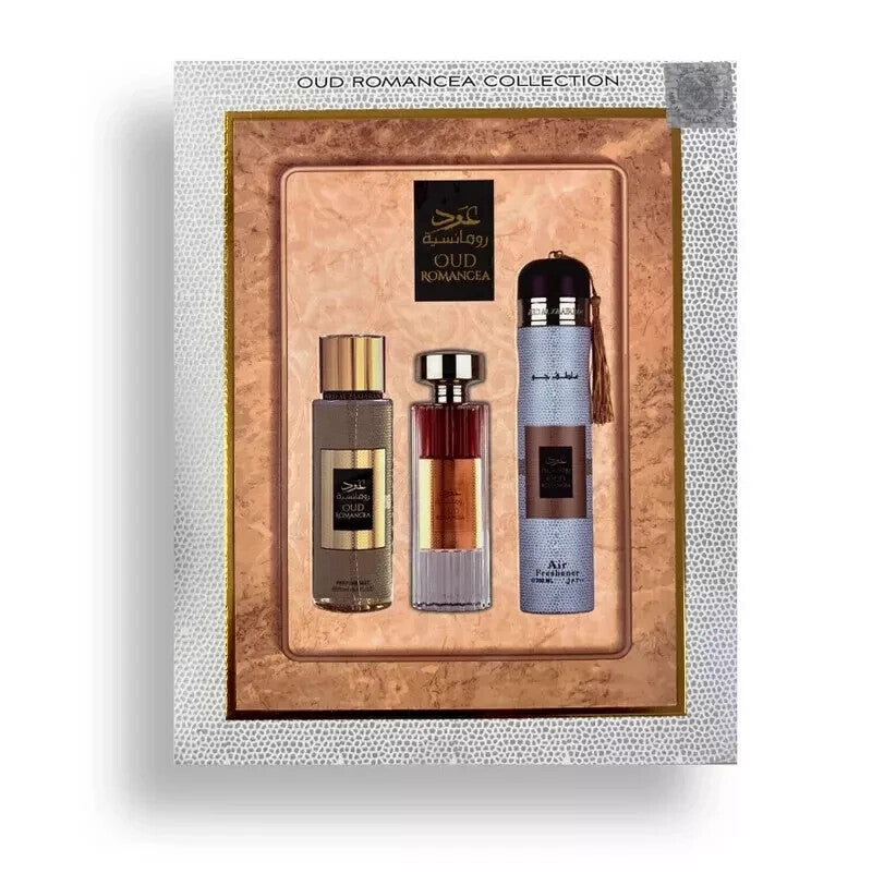 Indulge in the luxurious scents of our Oud Romancea 3 Piece Gift Set Collection by Ard Al Zaafaran .