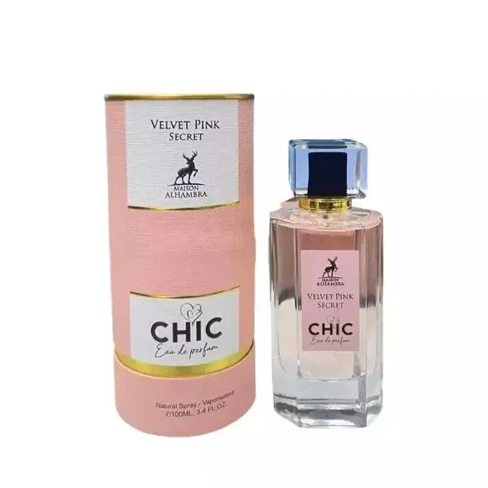 Velvet Pink Secret Chic Eau De Parfum by Alhambra is a luxurious fragrance that exudes femininity and sophistication.